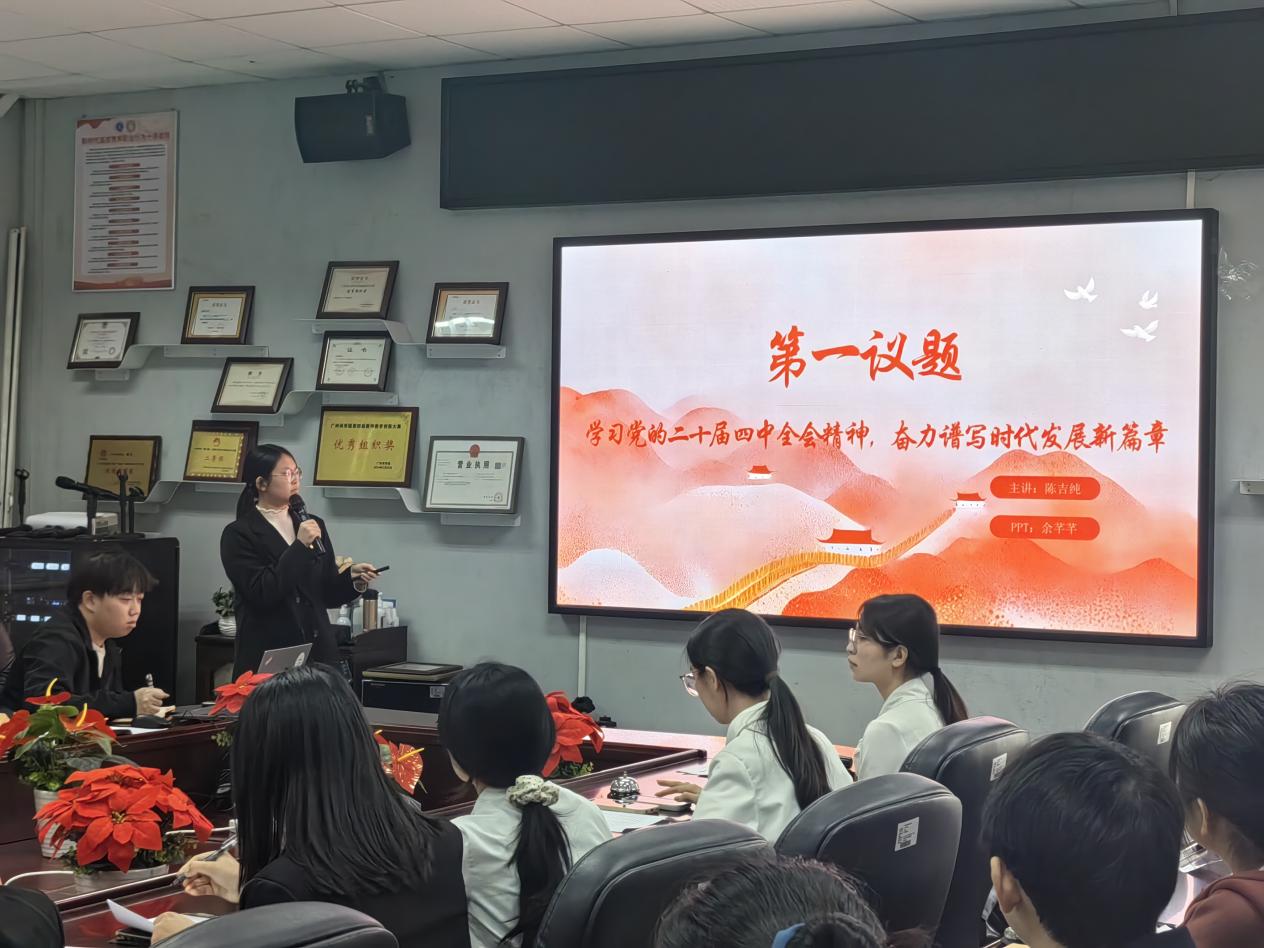 会议严格落实“第一议题”制度,支部员工党员陈吉纯带领全体成员学习贯彻党的二十届四中全会精神。陈吉纯同志围绕全会精神的时代背景、核心内容与实践价值展开领学,强调青年党员要立足时代坐标,将个人理想融入国家发展大局,把全会决议部署转化为具体行动;号召全体党员主动对接国家重大战略需求,夯实专业基础、助力乡村全面振兴,传承中华优秀传统文化,在强国建设、民族复兴的征程中勇担使、奋勇争先。