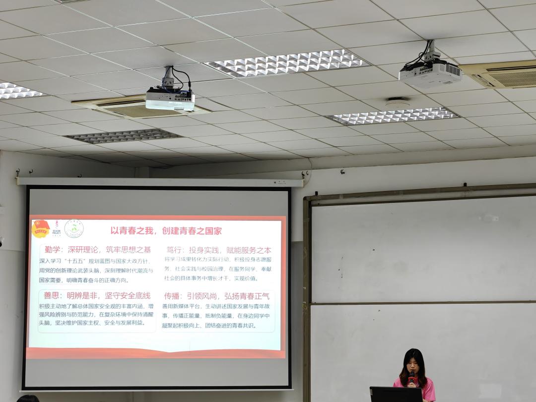 蓝美烔结合团支部工作实际,提出要以“青春铸魂”“实干筑梦”两大行动为抓手,完善组织建设举措,着力打造信念坚定、能力过硬、勇于担当的先进团支部,推动总体国家安全观在青年中落实落地。她强调,要通过“深读时代蓝图”系列学习活动筑牢思想根基,依托团组织体系深入同学、了解需求、回应关切;借新平台传时代强音,在安全与发展的动态平衡里,让青春步履踏准时代奋进的鼓点!